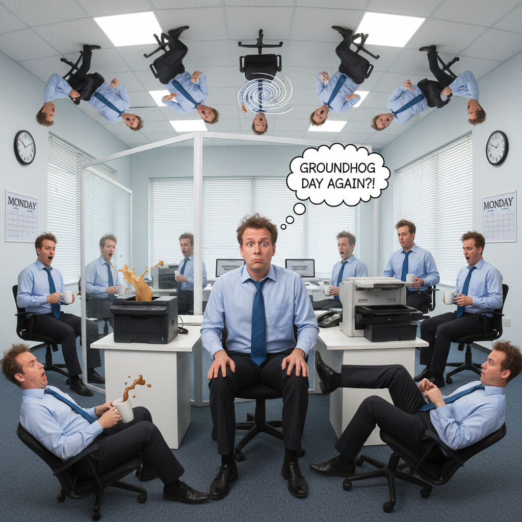 Image: Office worker reliving the same day in a comedic scene, a visual metaphor for workplace cycles.