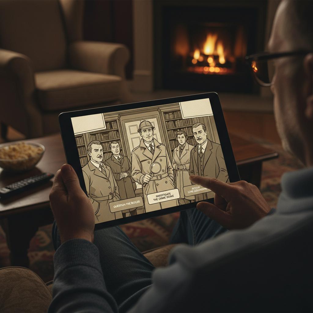 Alt: Person selecting options during an interactive whodunit movie, audience participation