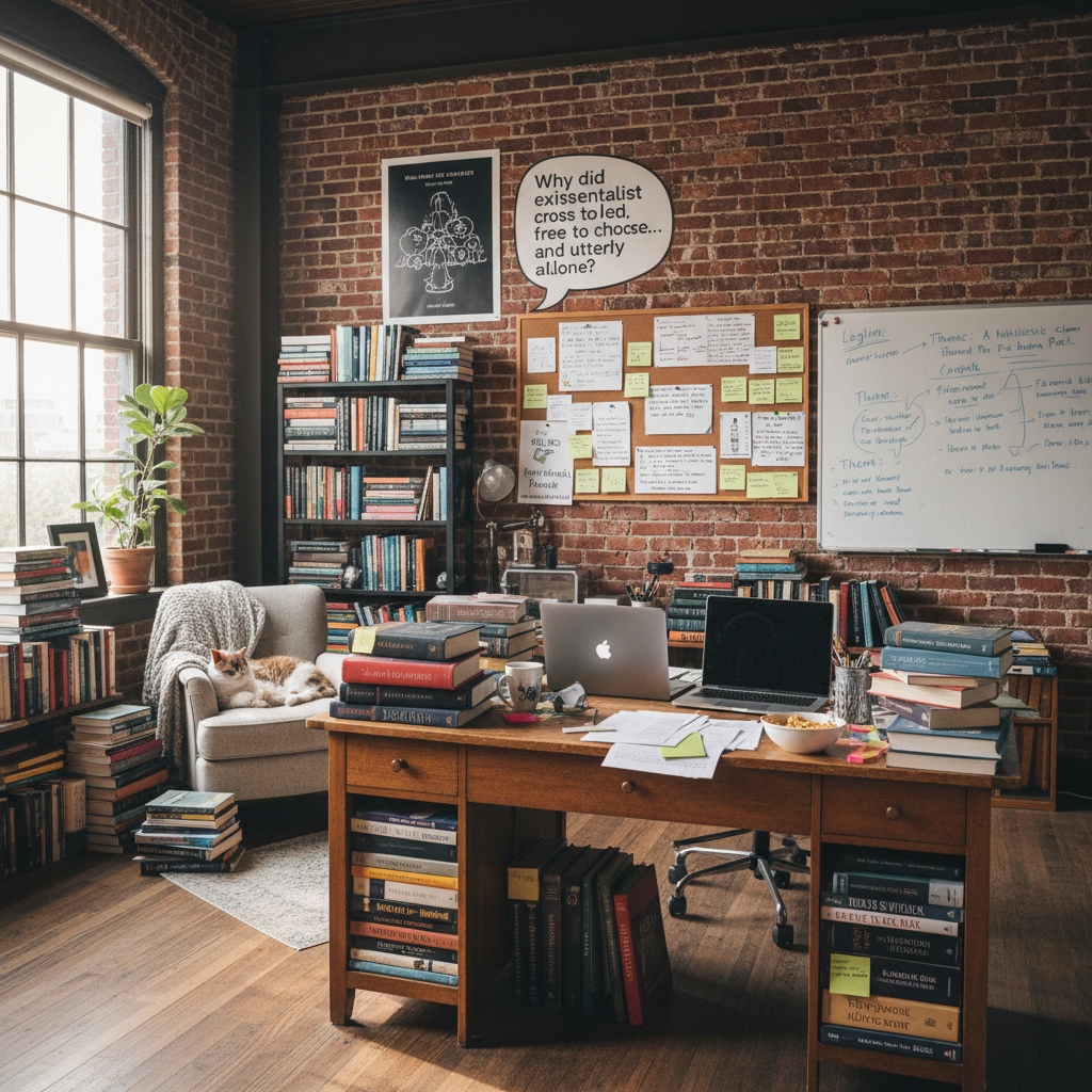 Screenwriter crafting a wise comedy script, drawing on philosophy and intelligent comedy traditions.