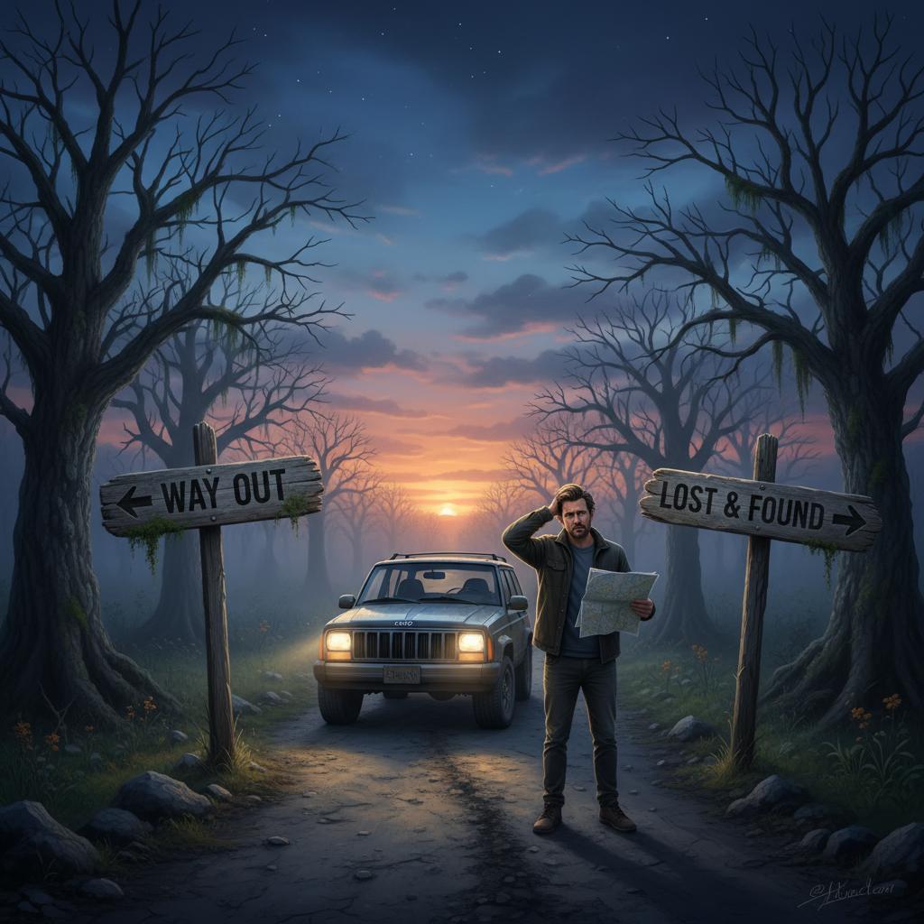 Image: Cinematic shot of a bewildered driver at a crossroads, dusk.