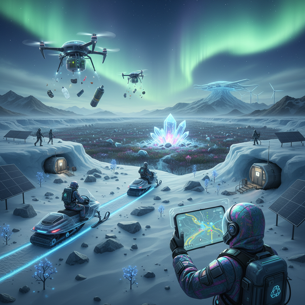 Alt: Futuristic concept art of an eco-friendly treasure hunt in the Arctic