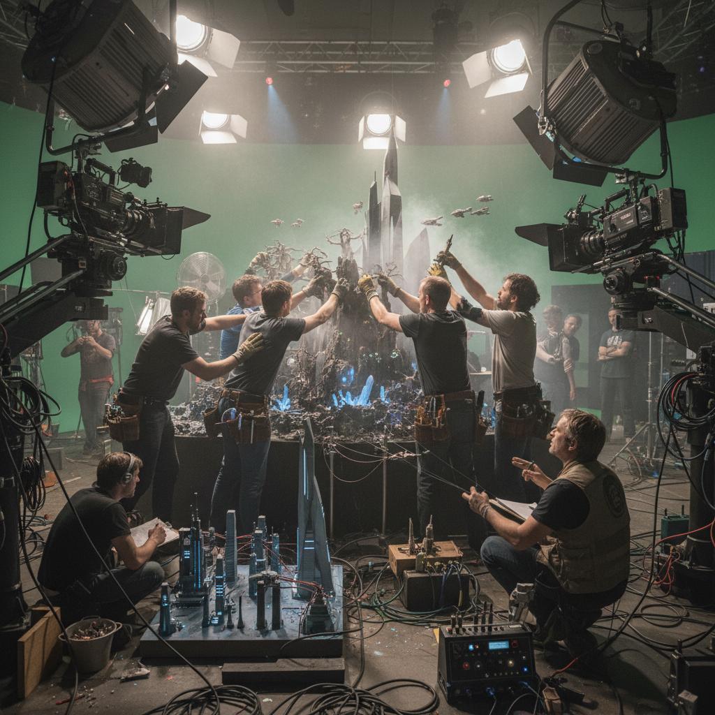 Practical effects team working on sci-fi set—proving that artistry matters as much as software.