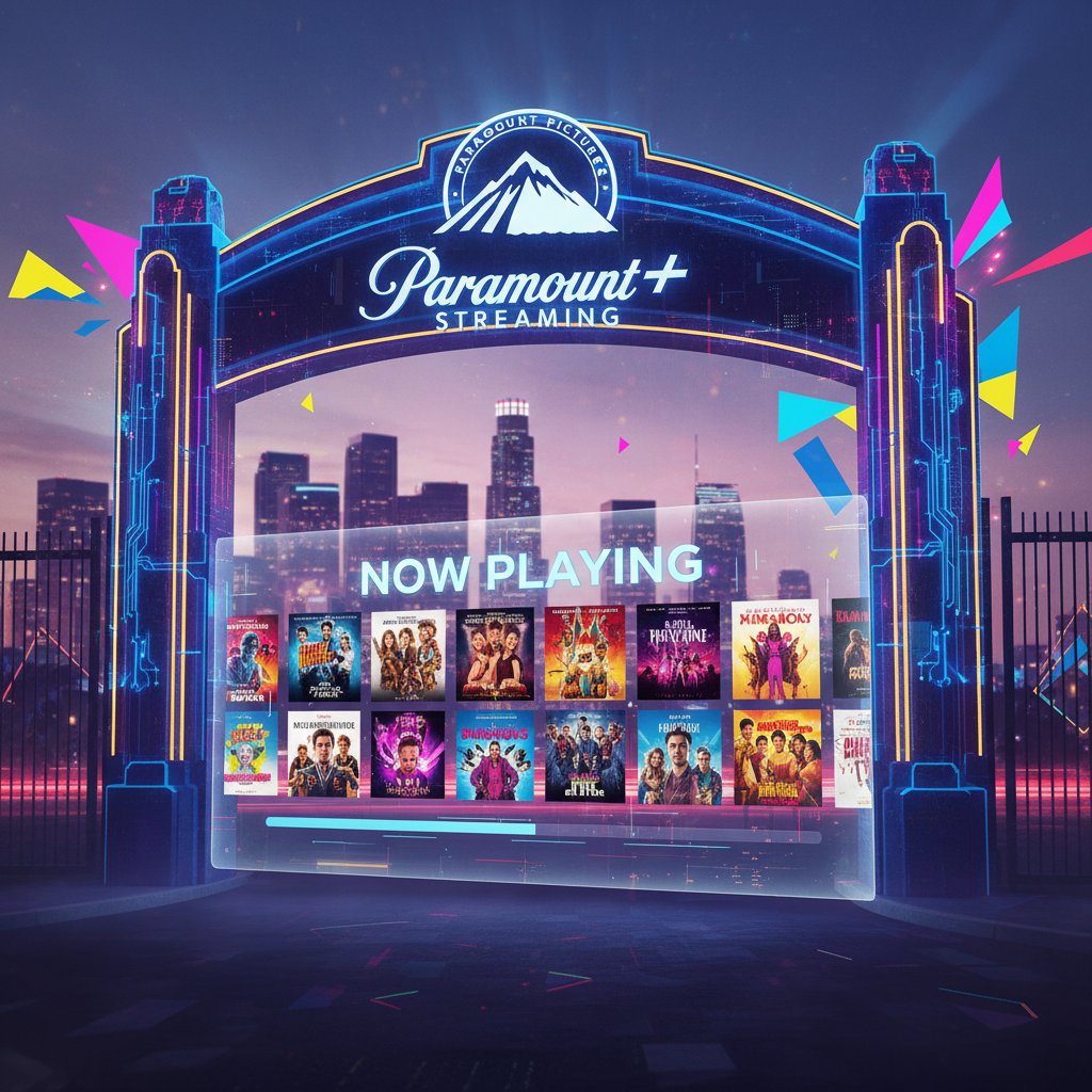 Alt: Paramount’s transformation from film studio to digital platform, paramount plus movies, bold colors, collage.