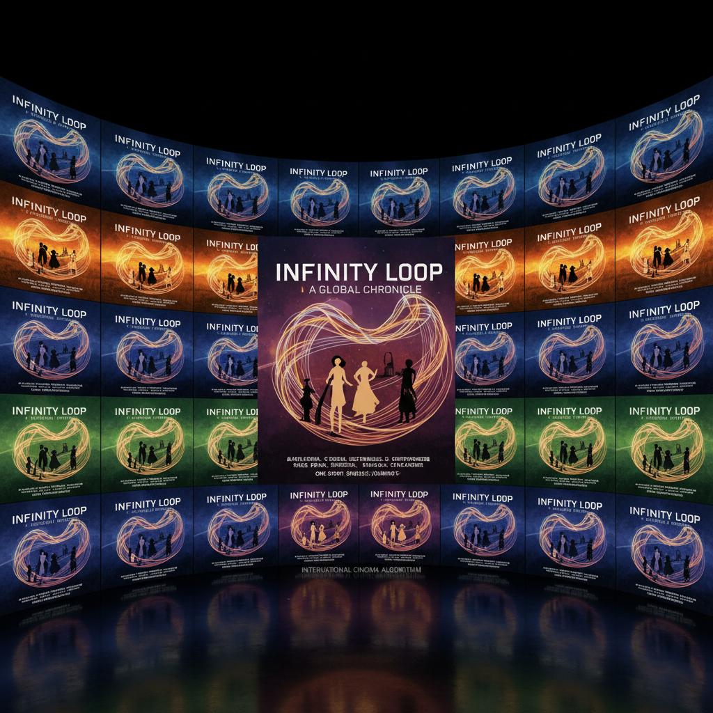 Alt text: Gritty visual of identical movie posters repeating endlessly on a screen, illustrating the feedback loop of algorithmic film recommendations, with an international cinema focus.