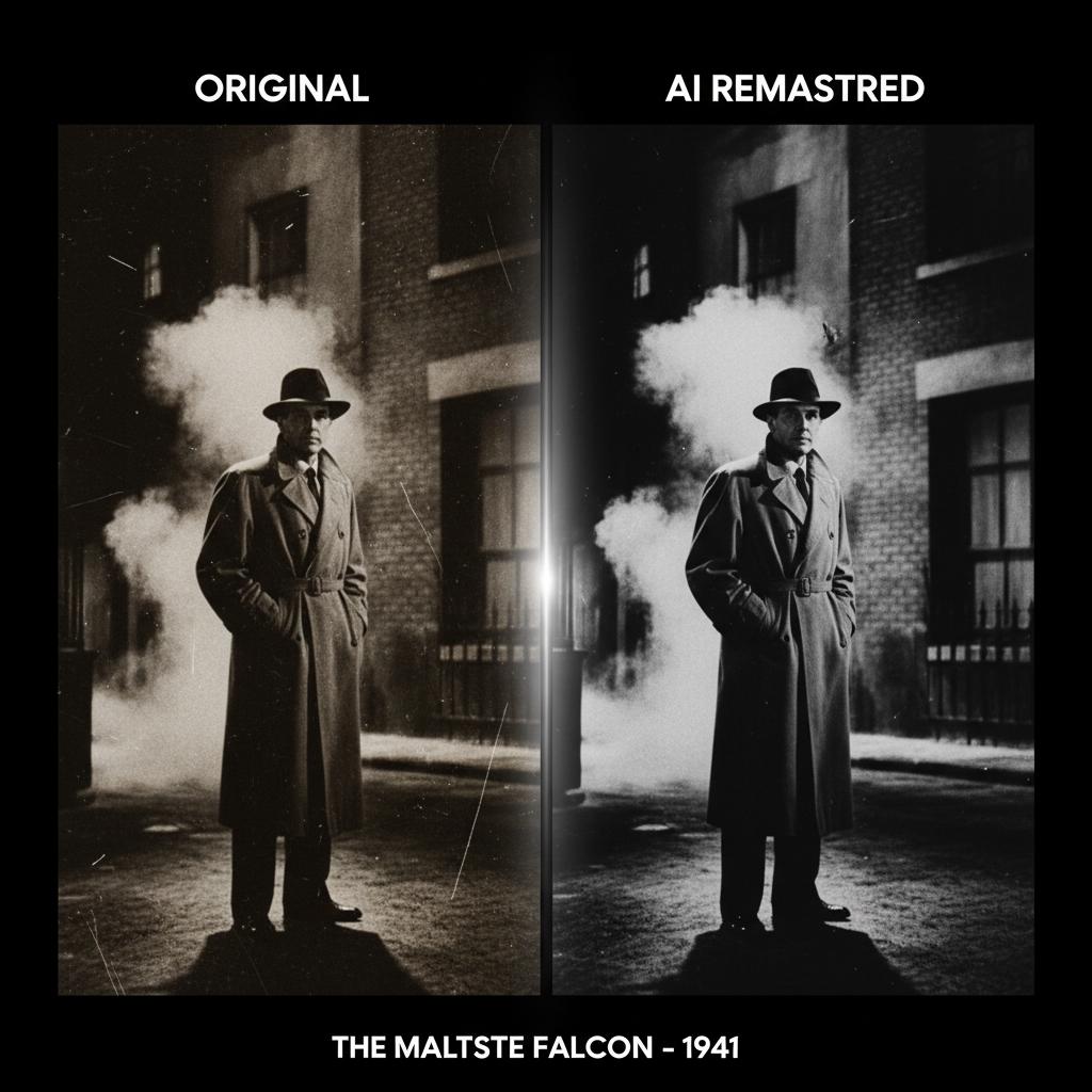 Uses algorithms to enhance lower-resolution material, often with mixed results—sometimes revelatory, sometimes artificial.