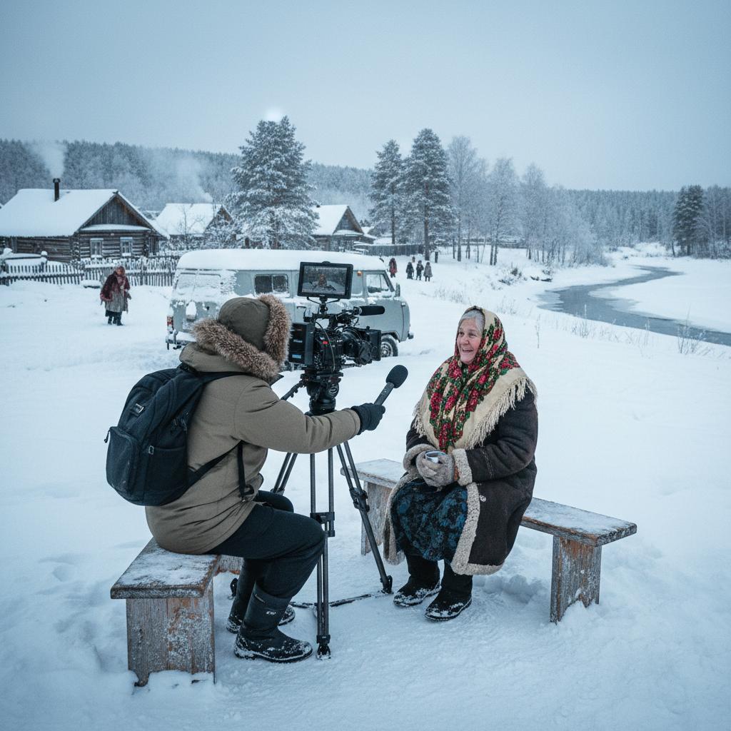 Documentary filmmaker interviewing locals in harsh Russian winter, illustrating authenticity of Russian movies