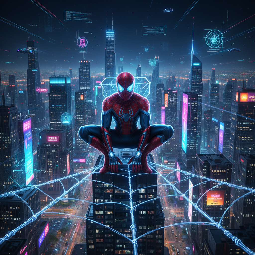 Descriptive alt text: Future Spider-Man concept art for upcoming movies with digital overlays and neon cityscape.